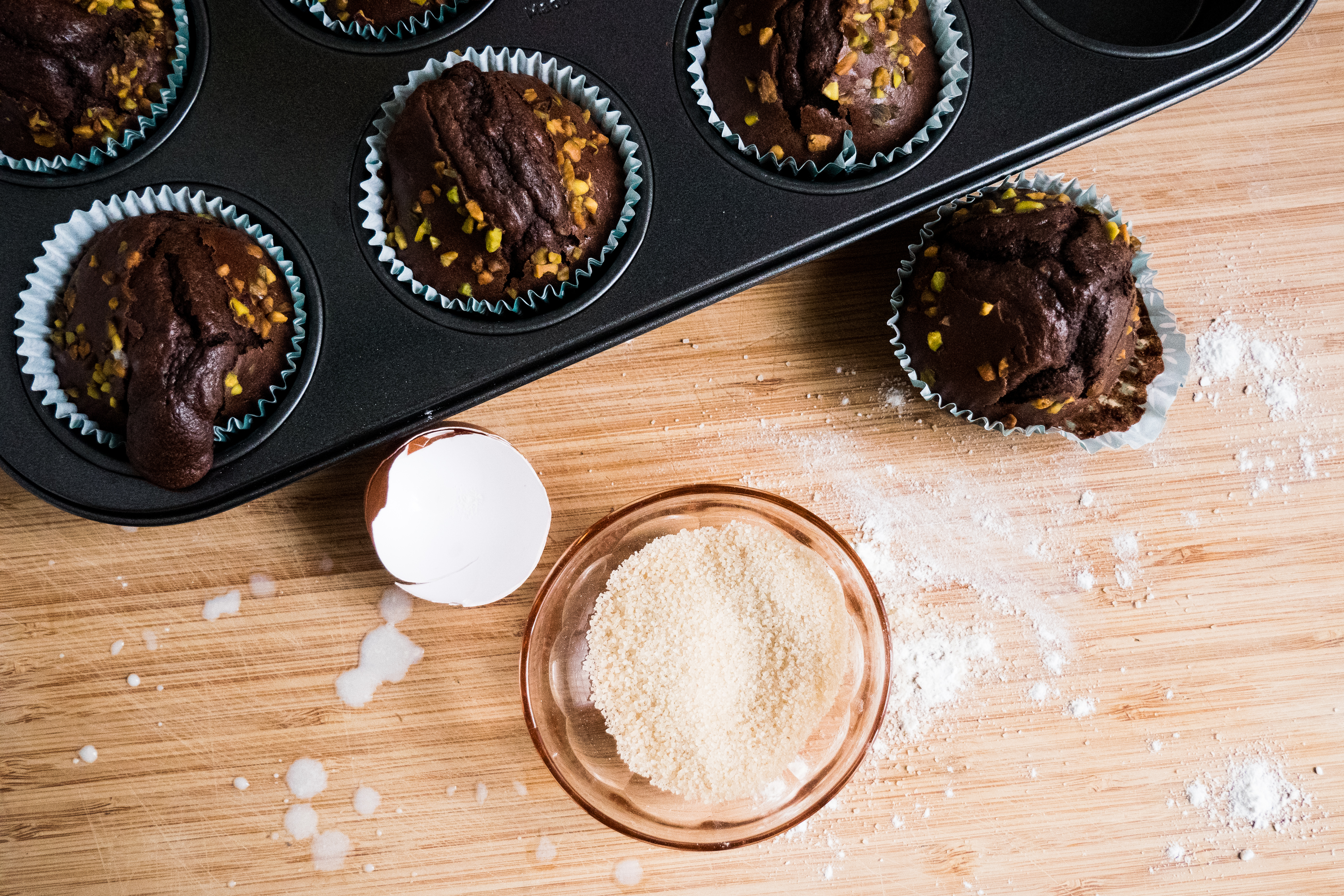 Etape 5 – Répartir votre pâte dans vos moules à muffin. Ajouter les dernières pistaches hachées en décoration sur le dessus de vos muffins. Enfourner 15 minutes à 190°C.